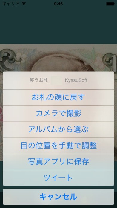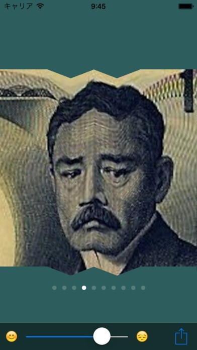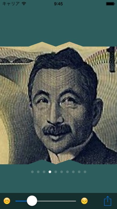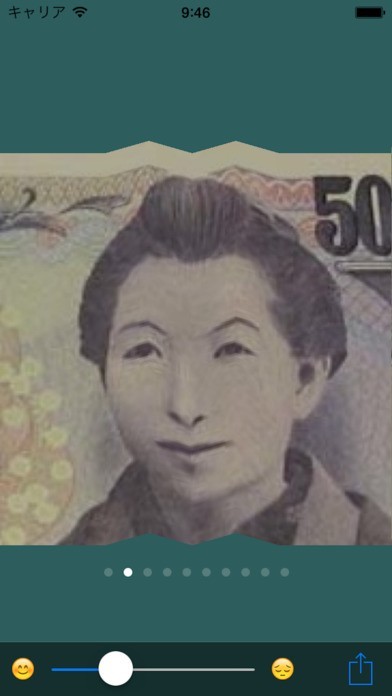 お札を笑い顔にするカメラアプリ! 子どもの頃に誰しも一度は試した、お札や教科書の肖像画に折り目を付けて笑わせるあの遊びがアプリで手軽にできます! 10名の著名人が肖像画として収録。好きな肖像画をアプリで加工して、にっこり笑わせたり泣かせたりと遊んでみましょう! もちろんカメラで撮った写真も加工可能! 自分の顔や友達の顔を自動で検出し、表情を変化させることができます。 暇つぶし用のカメラアプリとして、友達と一緒に笑えるジョークアプリとして活躍してくれます!