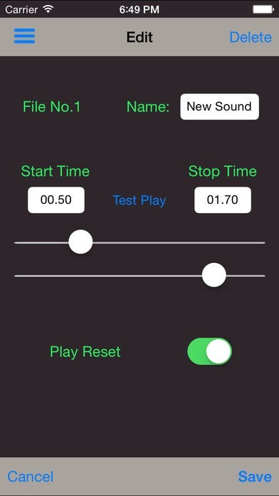 Rec画面中心に表示されるボタンを押すことで身の回りの音を録音できます。録音した音声データはEdit画面でテスト再生でき、スタートタイムとストップタイムを設定することで効果音が作成できます。