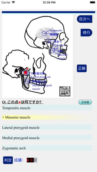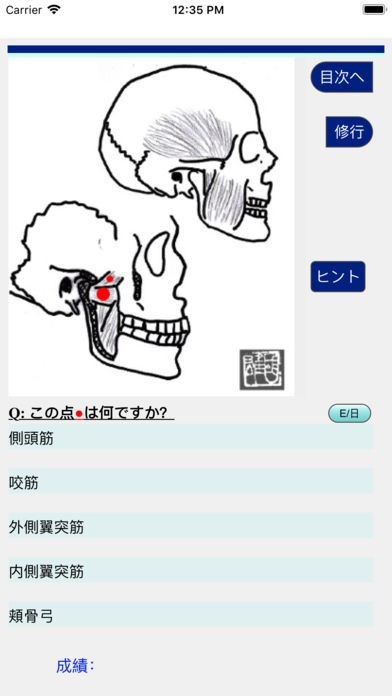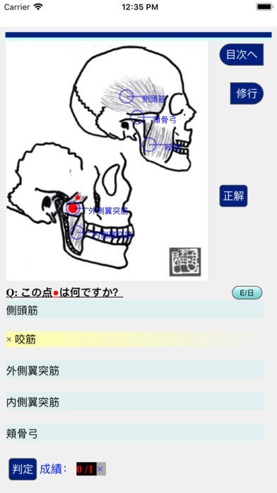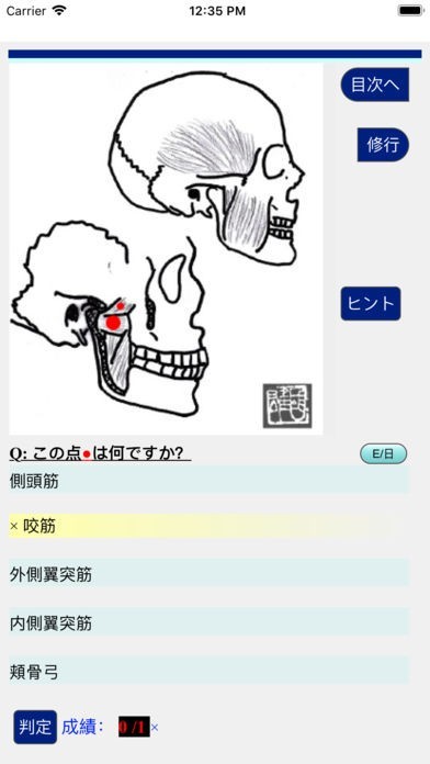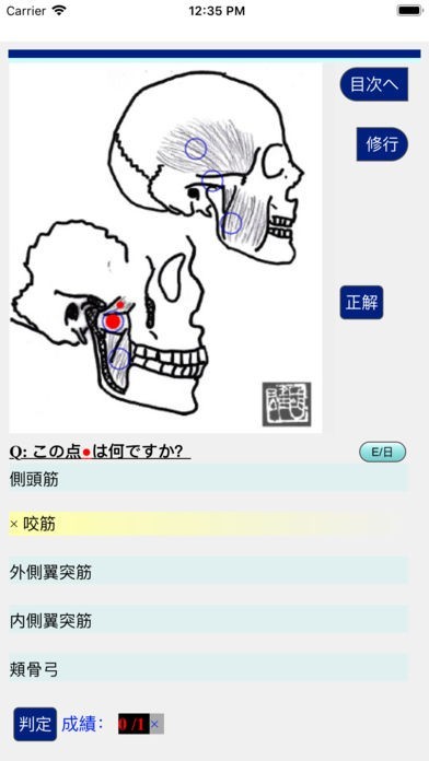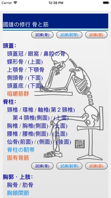 使い方: 1:目次画面で骨・靭帯・筋の項目を選択する。問題マークがそのスケッチ上に表示されます。2:解答選択枝の中の項目をタッチする。3:「判定」ボタンをタッチすると、正否〇×が表示されます。4:「ヒント」を1回タッチすると、選択枝に対応するマーカーが表示されます。再度、「ヒント」をタッチすると、解答が表示されます。5:反復学習するには「修行」、目次画面に戻るには「目次へ」をタッチします。6:目次画面の「試練」ボタンをタッチすると、いずれかの問題が提示されます。