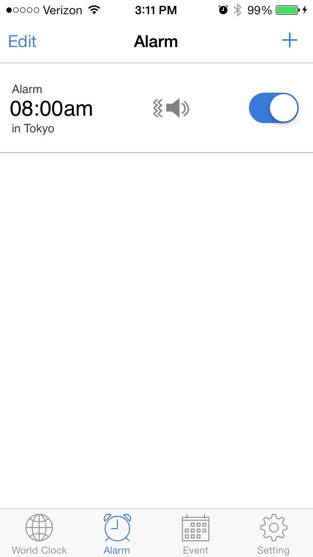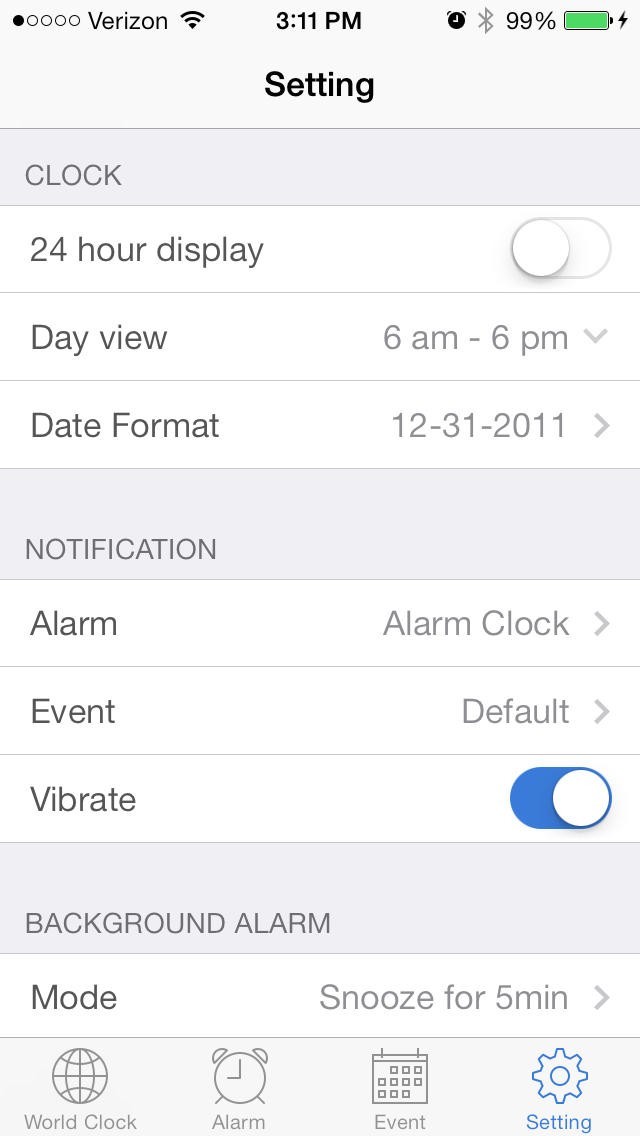 5。アラーム(Alarm):iPod / podcastで音楽を呼び寄せて、アラーム音として使用可能で、スヌーズ(snooze)機能が含まれています。 ios4以降では、バックグラウンドのアラームが可能です。