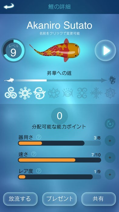飼育する鯉は交配させるだけでなく、魚を与えてレベルを上げることもできます。長くプレイすることで鯉からさらに別の生き物へ進化するなど、やりこみ要素のあるゲームが好きな方におすすめです。手に入れた鯉の模様は共有できますから、友達と珍しい鯉を求めて競い合うのも良いでしょう。