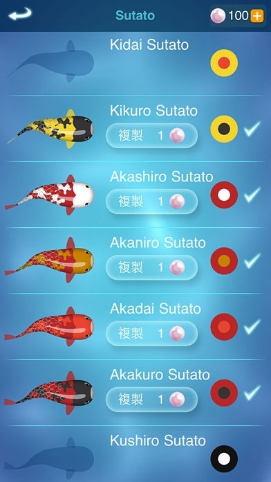 同色や同模様だけでなく分配と呼ばれる魚をかけあわす作業で、色々な鱗の出方の模様パターンを発生できます。ランダムに誕生した結果レアさが違ってくるため、図鑑要素もあります。