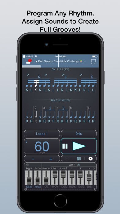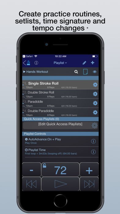 練習したいフレーズやリズムパターンをシンプルなインターフェイスで素早く簡単に入力することができます。店舗はもちろんメトロノームサウンドのマスタリングもいじることができます。