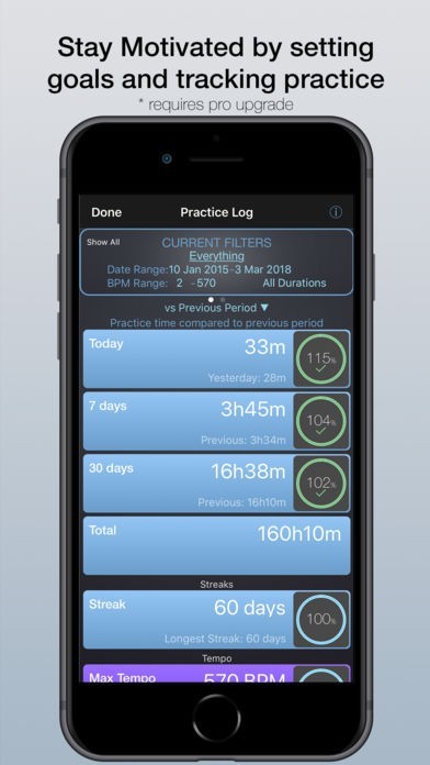 超高性能で制度の高いこのメトロノームは、スタジオでのバンド練習、個人練習や、楽器のレッスンでテンポ目標として使うことも可能です。練習の目標を入力して長期的にモチベーションを保ちましょう。