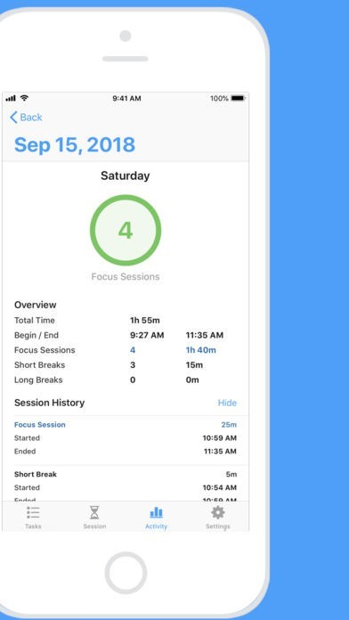 日や週、月ごとにどれだけ集中したかを統計的に表示することができます。集中した時間を振り返ることで、次回に仕事をするときの課題が見つかります。どれだけ集中したかがわかるので、目標を失うことなく仕事を続けることができます。