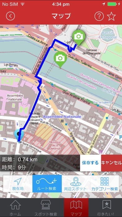GPS機能を使用して、マップを元に現在地から目的地までのルートや距離、移動にかかる所要時間などの情報を調べることができます。ルート検索は必要に応じて保存しておくこともできます。