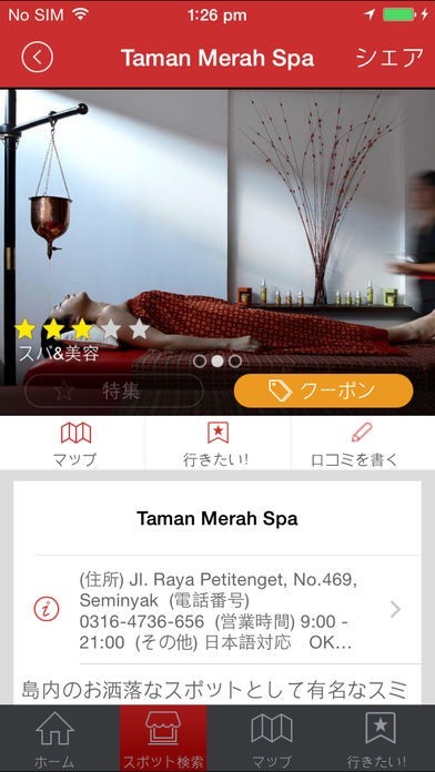 App Storeより引用インドネシアのバリ島で、現地の最新情報を発信するアプリケーションです。旅行者が海外旅行を何倍も楽しくできるレストラン、スパ、ショップ等の情報が満載です!本アプリで現地情報をゲットして、さらに充実した旅を!