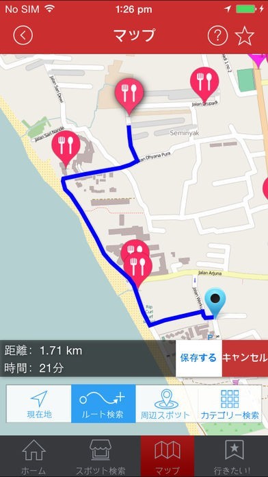 ・現在位置(GPS)、ピンドロップした位置、スポットの組み合わせからルート検索ができます。