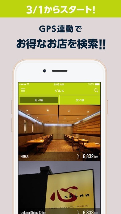 アプリに搭載されているGPS機能を用いることによって特典を受けられるお店を現在地から近い順に見つけることができます。もちろんお店の名前を入力して検索することもできます。