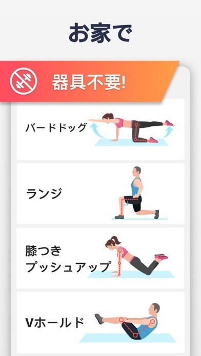 あらゆるレベルの男性と女性に適したワークアウト。目的に応じて個人に合わせた、短時間で行える効果的なホームワークアウトのルーチンを作成します。ワークアウトの負荷が徐々に増加するので、簡単に続けることができます。