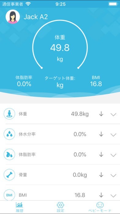 5. ユーザー設定画面でお名前、身長、性别、年齢、ユーザーランク、ターゲット体重(人体秤)を入力できる。