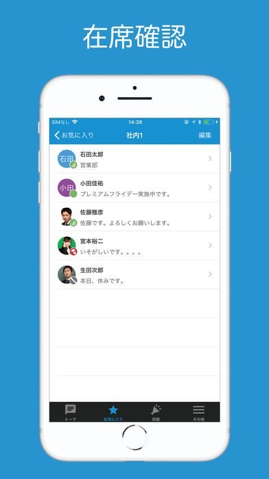 チャットアプリ固有の未読か既読を確認できる機能はもちろん、グループチャット中におけるメンバーの出席状況も確認することができるので、すぐに返信がもらえるかどうかが送信者からも分かりやすくなっています。