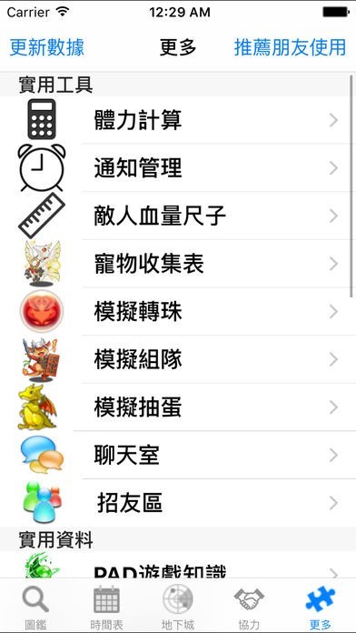 另外有其他功能,例如:敵人血量尺子,遊戲知識,活動提醒,模擬轉珠,模擬抽蛋,模擬組隊,寵物收集表及體力計算等。