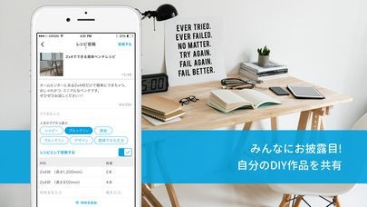 「HANDIY」はDIYの事例を共有スルことができるアプリです。キーワードから検索すれば、実際の写真や詳しい情報が閲覧できます。材料や寸法も詳しく記載!参考にしながら自分でも作ってみることができます。ジャンルごとにタグがつくので、気になる作品がすぐに見つかります。また、お気に入りに登録すれば写真を一覧で見ることが可能、コメントをつけることも。ユーザーでフォローすれば最新情報がマイページに表示されますし、その方の気に入りを表示することができます。