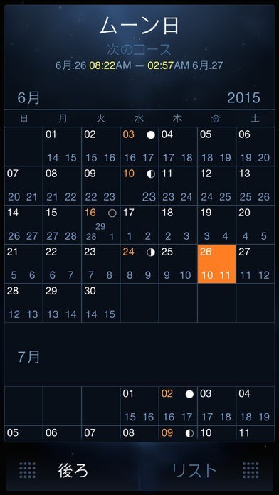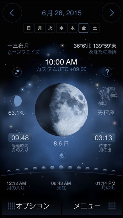 月の出、月の入りの時間や、月の満ち欠けのパーセンテージなど、月に関する予報や情報が詰まった天体カレンダーでスマホに入れておくと美しい月の姿が見れて癒されます。