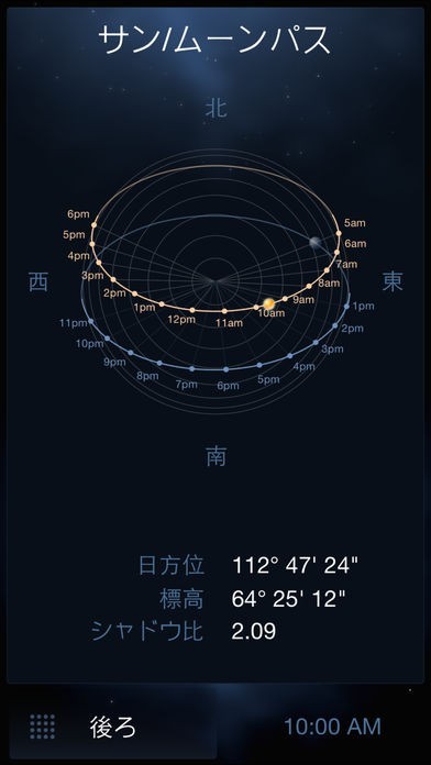 太陽と月の動きを一日かけて観測したいという方におススメです。太陽が出る瞬間から月が沈むまでをリアルタイムで捉えることが可能です。月に関しては夜に出る形が3Dグラフィックで表示されるので便利です。