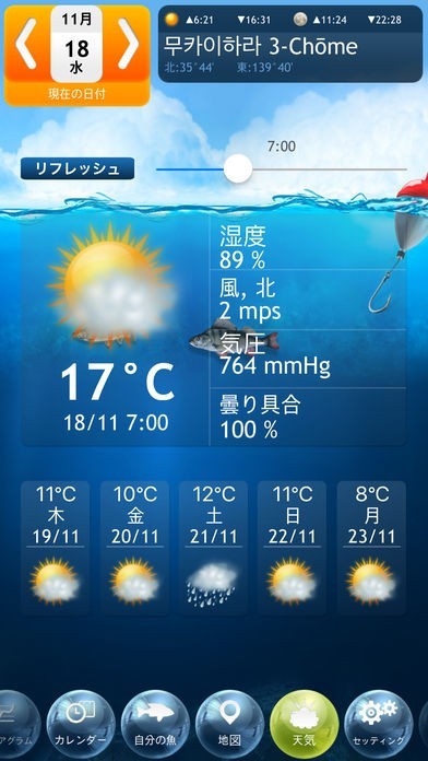 釣りの最適日が表示出来るだけでなく、レポート機能が搭載されているため、釣った場所を登録したい際にも良いです