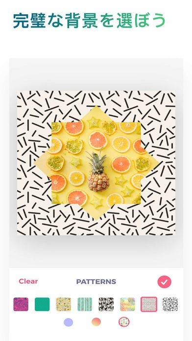 完成した作品をInstagram等に共有する事が可能です。また画像のコントラストや明るさが修正出来ると同時に、回転や反転等の作業が行えるのもメリットでしょう。背景の色やテーマが調整出来るのも特徴です。