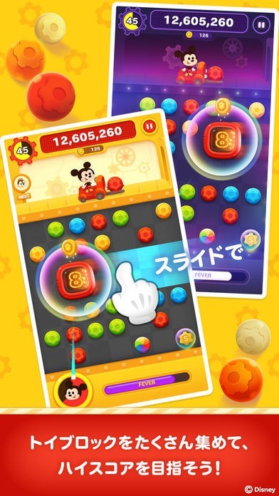 チビキャラたちがブロックを乗せてベルトコンベアから流れてくるので、流れてきたブロックと同じカラーのブロックをスライド操作で集めていく簡単なパズルゲームです。ディズニーがモチーフになっていて可愛いデザインになっているので子供も大人も楽しめます。