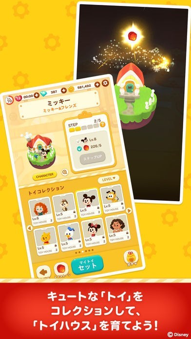 ゲーム終了後に獲得したトイストーンを集めるとキャラクターたちのトイハウスをレベルアップさせることができます。トイハウスのレベルアップには、キャラクターのレベルアップと規定数のトイストーンが必要になるので、たくさんプレイしてトイハウスを発展させていく楽しさも味わいましょう。