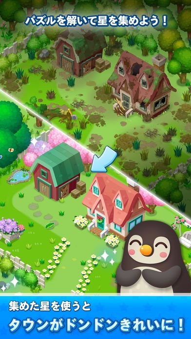 ゲームと町づくりをするストーリー展開があります。パズルゲームでミッションをこなして星をもらいます。この星で、ストーリーを進めるためのお仕事をして、町をきれいにしていきます。