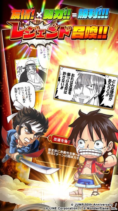 ジャンプ作品が集合したゲームだけあって、「友情」「努力」「勝利」が重要なポイントとなっています。パズルでのバトル中にはサポートキャラを呼び出し、友情ワザとして派手な必殺技を繰り出すことが可能。召喚ゲージを努力で上げることができれば、伝説の英雄級ジャンプキャラをレジェンド召喚として召喚させ大ダメージを敵に与えられます。友達たちと努力し、勝利を掴もう!