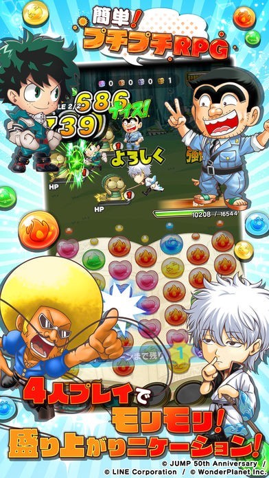 ジャンプの人気キャラクター達が可愛くパズルゲームを戦っていきます。一部の人気漫画だけではなく、創刊から現在も連載中の漫画作品まで幅広く網羅されているため往年のジャンプファンも楽しくプレイできるでしょう。登場キャラも主役級だけではなく、シティハンターの海坊主や銀魂のエリザベスなど人気キャラを網羅。好きなジャンプキャラだけで自分だけのオリジナルチームを組もう!