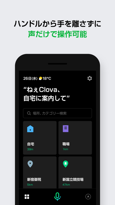 「一番近くのコンビニまで案内して」「あと何分かかる?」 などと話しかけるだけでAIアシスタント「Clova」が地図の設定やご返答します。