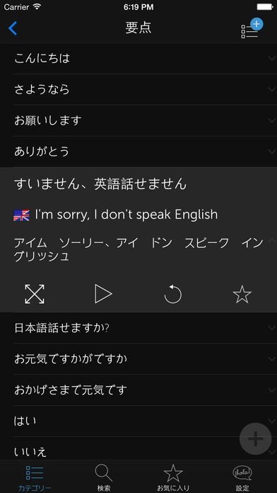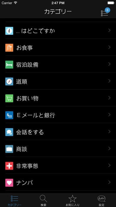 シチュエーションごとのカテゴリ分けで、必要なフレーズを簡単検索!
