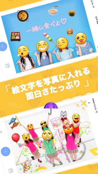 超簡単に使える。写真一枚を撮り、または一枚の図を選び、好きなEmojiシールを何枚追加しても良い。IOSシステムにあるエモジだけではなくいろいろ面白い物は選べる。