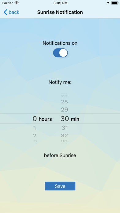 例えば日の出を見てから会社に出かけたり、暗くなる前に自宅に帰るなど太陽の動きが気になる場合に通知を設定してみましょう。あらかじめ設定しておいた時刻になると通知が送られてきます。