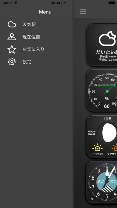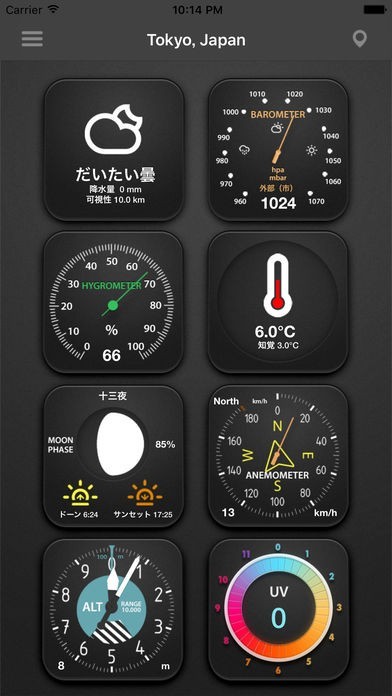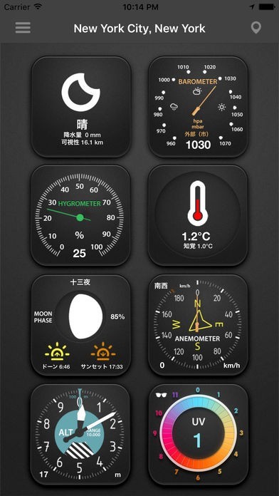 天気、湿度、気温などが計測器になって一覧表示されているので、見た目にも見やすい構造になっています。UVレベルも分かるので、紫外線がきつい夏場には特に役立ちます。