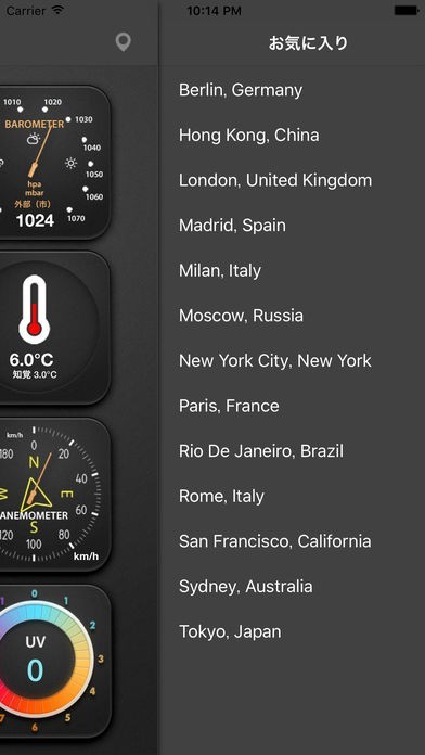 お気に入り機能が搭載されており、よく見る地点は無制限に登録しておくことができます。お気に入りタブを押して、都市を選ぶだけで天気などが分かるので、操作も簡単です。。