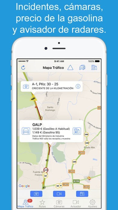· Haz zoom para ver gasolineras con sus precios, cámaras y radares