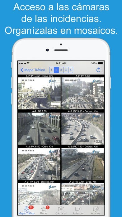 · Cámaras de tráfico: contrasta la información oficial con las imágenes de las cámaras (si tu comunidad / ayuntamiento tiene cámaras que no están en Tráfico NO!, escríbenos y trataremos de añadirlas a la app, la mayoría de las comunidades NO tienen un servicio propio de tráfico, pero están incluidas en las cámaras de la DGT). Puedes organizarlas en mosaicos y favoritas.