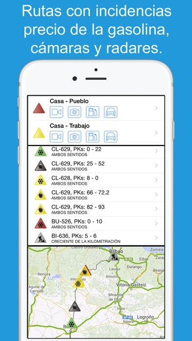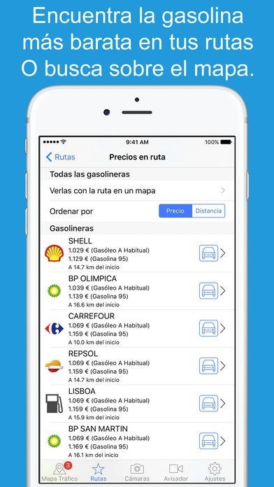 · Crea rutas para encontrar las gasolineras ordenadas por precio, cámaras de tráfico, radares e incidencias que hay en ellas