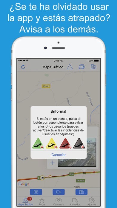 · Mapa con Google Traffic e incidencias de la DGT, SCT, Andorra y ayuntamiento de Zaragoza, además de las incidencias enviadas por los usuarios de Tráfico NO! (ayuda a los demás enviándolas si estás atrapado en un atasco)