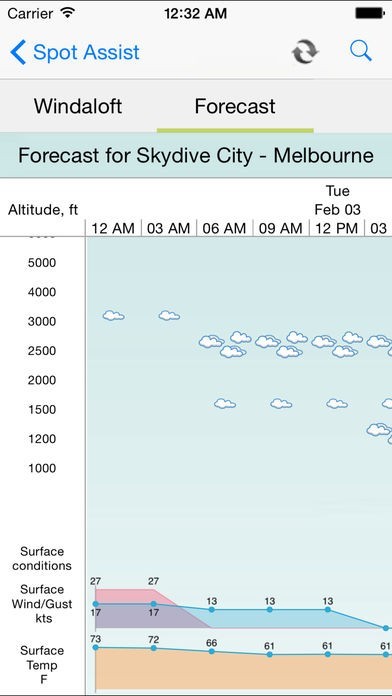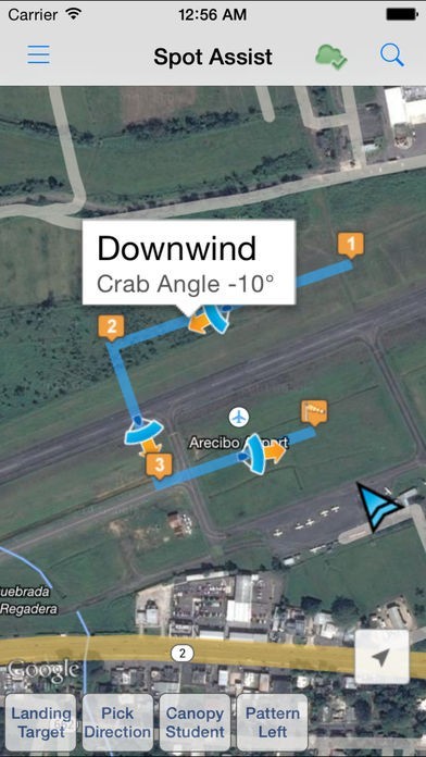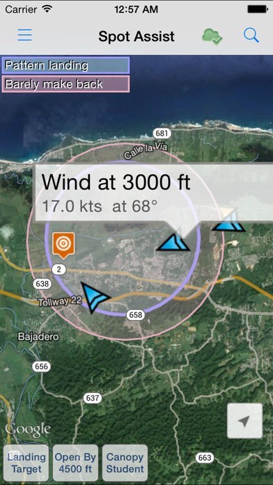 App Storeより引用Shows skydivers current weather, winds, the best exit area and pattern in current wind conditions.