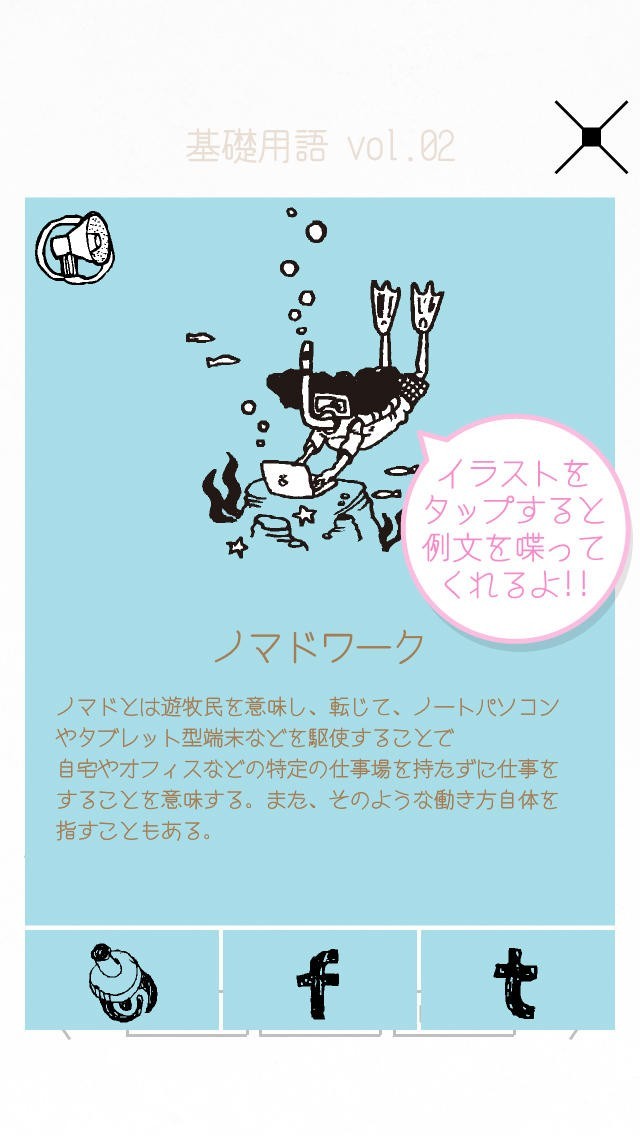 ビジネスの話や会議で出てくる横文字の意味をわからないまま放置しておくと仕事に影響が出てきてしまいますが今更人には聞けない場合もあると思います。そんな時に2つのイラストから意味の合っているイラストを選択する『よこもじあんちょこ ビジネス単語帳アプリ』ならクイズ形式なので楽しく遊びながら学べます。 クイズに正解するとその横文字の説明やメガホンのアイコンが出現するのでタップすると例文を再生してくれるので使い方を教えてくれます。さらにそのイラストが気に入った場合はスタンプのアイコンをタップするだけで保存できるのでLINEなどに使用できます。