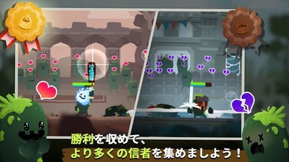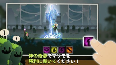 チャーミングなマリモの戦士をバトルさせている際中に「奇跡」を使って武器や回復のアイテムを与えることが出来ます。タイミングが合わないと投げた武器を敵に拾われて使用されてしまうので気をつけて下さい。勝利すると観客が信者になってくれレベルがアップしていきます。また、観客がくれたお金を回収するのも忘れないようにして下さい。