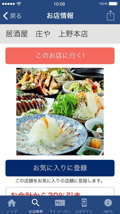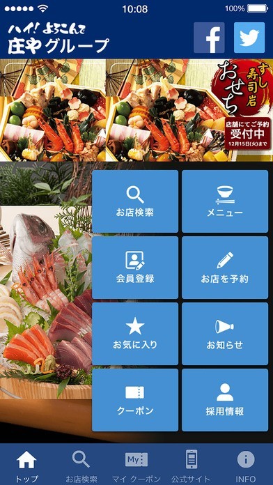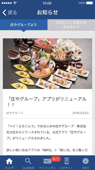 たくさんある「庄やグループ」に属する店舗のあらゆるサービスを受けることが出来るようになります。例えばアプリ中央下部にある「マイクーポン」というところを触るだけで、お会計から20パーセントオフなどというとてつもなくお得なサービスをうけることが出来ます。さらには時間限定でさらに役立つようなクーポンを使えるので、活用できればお財布に優しいアプリであることは間違いありません。さらには採用情報で、職を探している人にとって役に立つような情報も得ることが出来ます。さらに「お店を予約」で店に入れないといった心配をする必要さえなくなります。