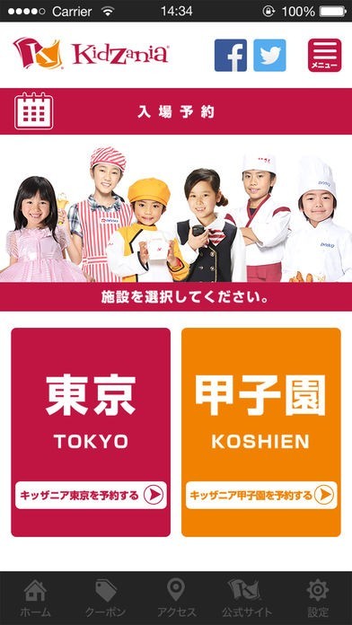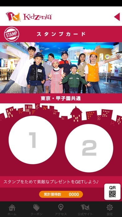 キッザニア公式アプリ限定スタンプカード、キッザニア東京、キッザニア甲子園のお得な情報などが確認できます。