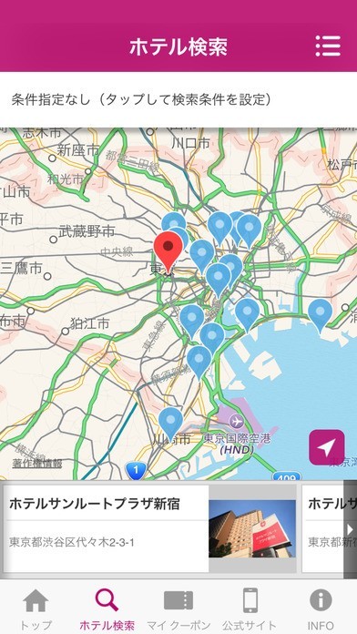 ホテルの検索とホテルまでの経路の表示ができる