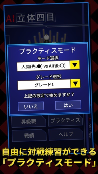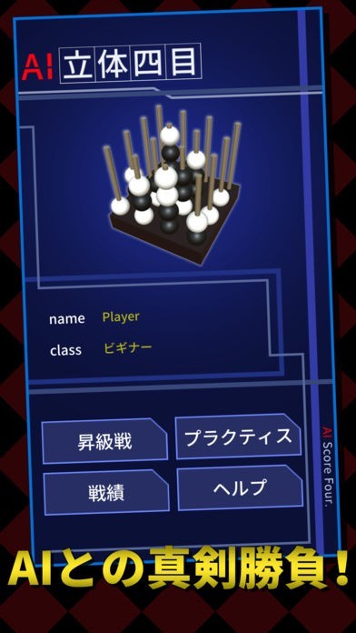 立体四目の魅力をそのままに、コンピューターAIとの対戦形式でアプリ化。対戦相手を探す苦労もなく、いつでもどこでも手軽にプレイ。