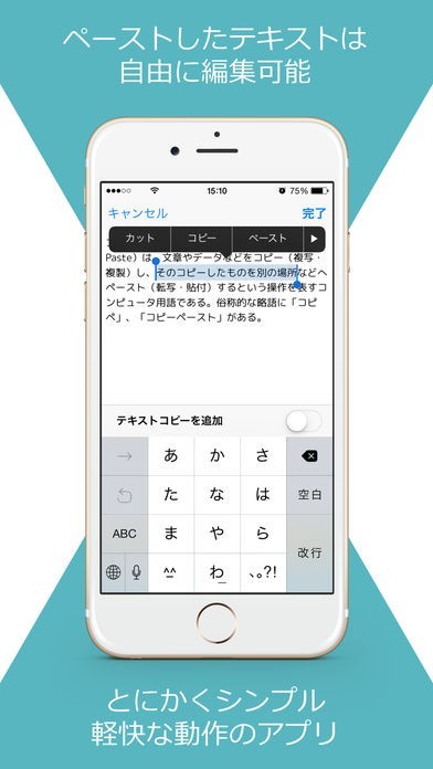 コピーした文章の内容は何度で再編集ができます。文字入力はもちろんカットも可能なので、長文を変えたい時にも便利です。いらないコピーはフリックで瞬時に削除できるため、整理に時間がかかりません。