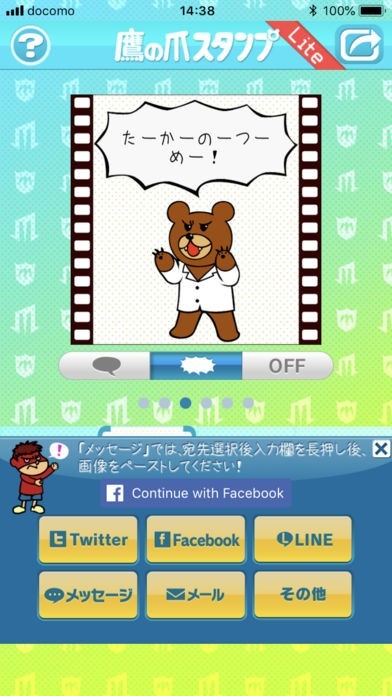 Twitter, Facebook, LINE, メッセージ(MMS), メール, 別のアプリに投稿することが可能です。