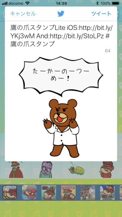 App Storeより引用『秘密結社 鷹の爪』から、オリジナル画像の作成/SNSやチャットへの投稿ができるデコメスタンプアプリ「鷹の爪スタンプLite」が登場です!