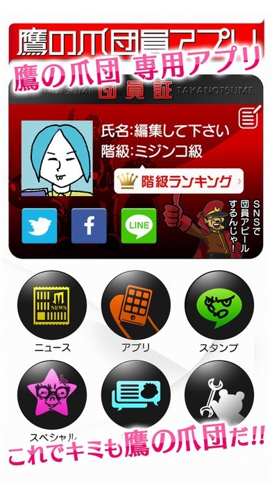 鷹の爪団のニュースを一度にチェックしたり、団員のみんなとワイワイ語り合ったりできる、毎日楽しめる鷹の爪団のアプリです。公開から3周年を記念し、大リニューアル!