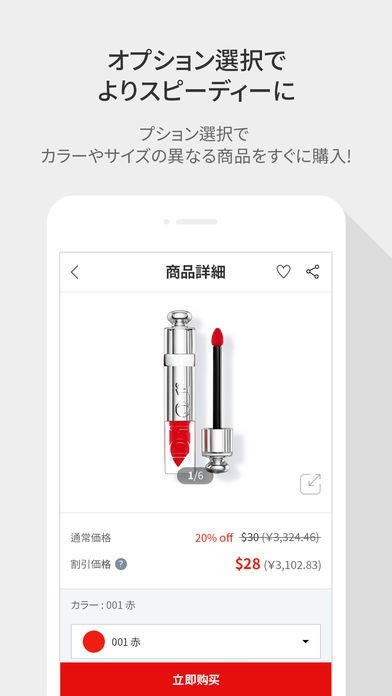 「ロッテ免税店 (Global Ver.)」では、欲しい商品が見つかったら商品を購入するボタンからワンタッチで注文を済ませることができます。サイズや色の選択も同じページから行えます。