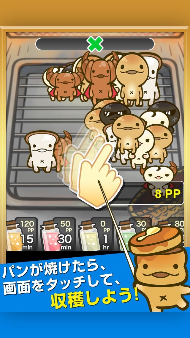 育ててパン工房は、魔法のパン酵母を使って様々なパンを焼き上げていきます。全部で20種類のパンが焼きあがります。どんなパンができるのかは、焼き上がりまでわかりません。図鑑機能があり、一つずつ集めていき、全種類をコンプリートする楽しみがあります。図鑑は後で見ることができます。魔法の酵母を選んだら、焼き上がりまでは待つだけです。オーブンは取り出すタイミングを見て、パンが焼きあがったら素早くタップして取り出していきます。取り出すのが遅くなってしまうと、パンが焦げてしまいます。 パンを取り出すとポイントがもらえます。ランキング対応で、全国の人と競い合うことができます。かわいいパンが焼きあがるので、パンに囲まれて癒されます。
